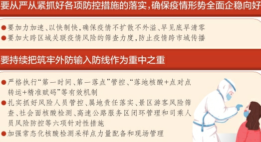 林武指出,经过全省上下持续奋战,我省局部输入性疫情应急处置工作取得阶段性成果,疫情形势朝着好的方向发展。越是这个时候,越不能掉以轻心,要从严从紧抓好各项防控措施的落实,确保疫情形势全面企稳向好。要加力加速、以快制快,提高流调、检测、追阳、转运、救治等各环节质量效率,深挖细查可能存在的隐匿传播风险,全面掌握所有传播链条和感染源,坚决有力阻断传播链条,严防续发传播风险,确保疫情不扩散不外溢、早见底早清零。要加大跨区域关联疫情风险的筛查力度,进一步提高区域协查效率,及时跟进有关处置措施,防止疫情跨市域传播。实行临时性静态管理的地区,要在严格落实管控措施的同时,做好区域内民生保障工作,最大限度减少对人民群众基本生活的影响。林武强调,要持续把筑牢外防输入防线作为重中之重,严格执行“第一时间、第一落点”管控、“落地核酸+点对点转运+精准赋码”等有效机制,扎实抓好风险人员管控、属地责任落实、景区游客风险筛查、社会面核酸检测、高速公路服务区闭环管理和司乘人员风险防控等六项针对性措施。特别是要汲取教训,对服务区有关防控链条进行再梳理再织密,做好工作人员个人防护,坚决杜绝疫情风险在服务区内传播,更不能通过服务区外溢到社会面。要加强常态化核酸检测采样点力量配备和现场管理,持续抓好隔离点达标改造,确保足够的检测力量和隔离场所储备。