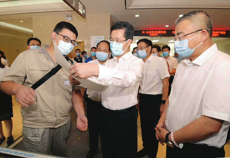 8月12日,省委副书记、省长蓝佛安来到省政务服务中心大厅,在商事登记全业务自助一体机前,认真察看创业者刚打印出来的营业执照,了解创业内容。(李兆民摄)