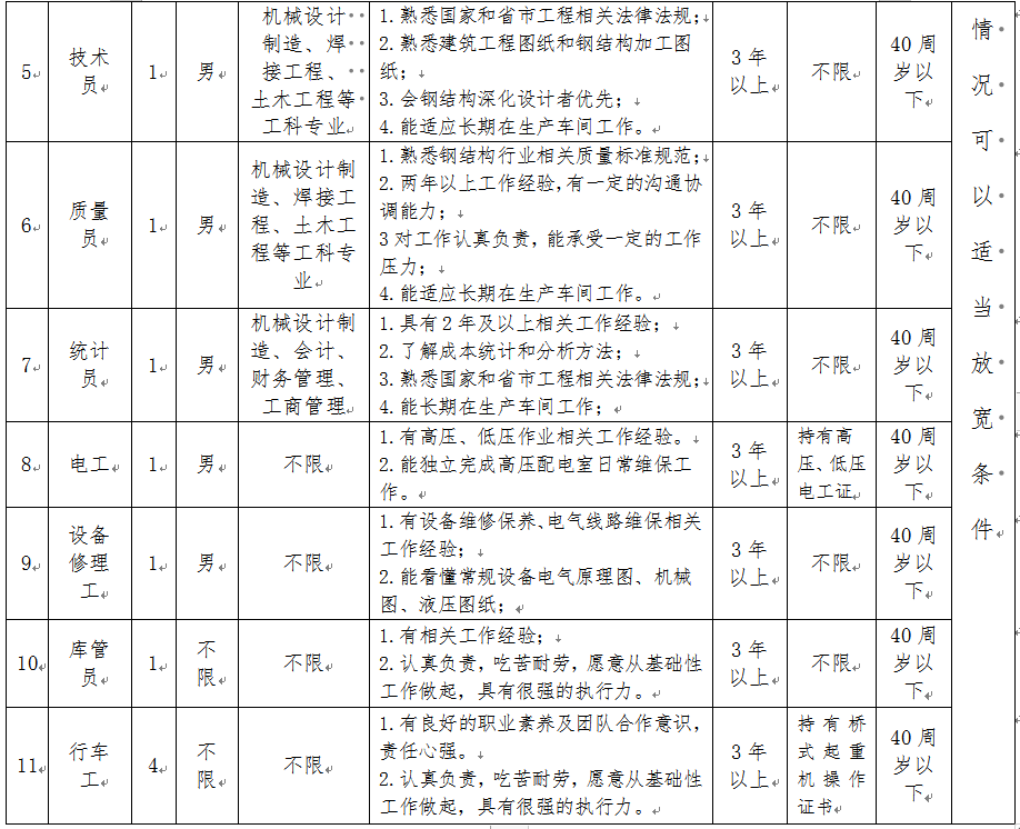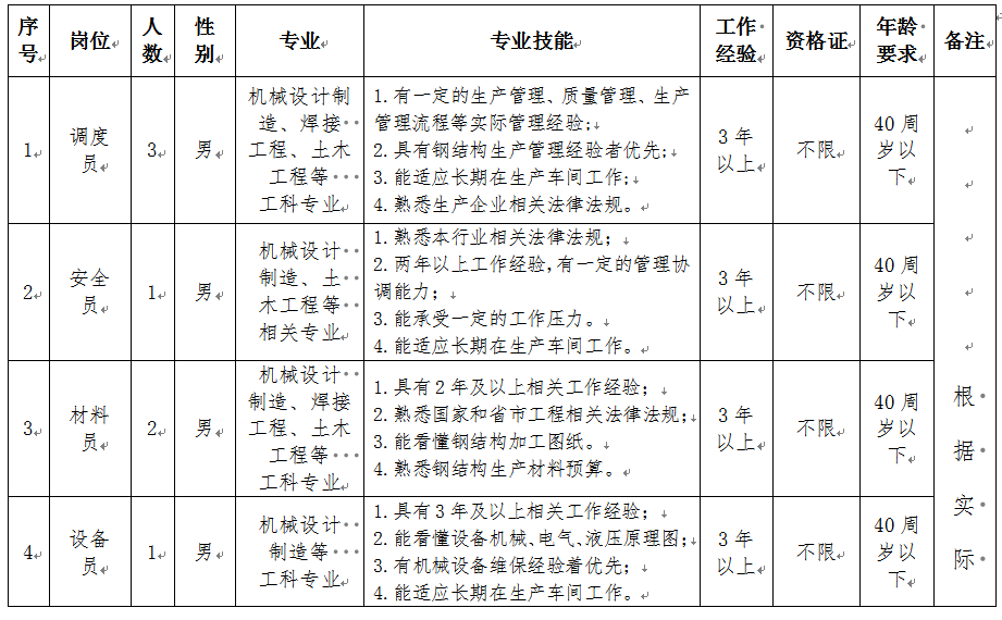 选聘人员包括调度员3名,安全员1名,材料员2名,设备员1名,技术员1名,质量员1名,统计员1名,电工1名,设备修理工1名,库管1名,行车工4名。具体要求如下: