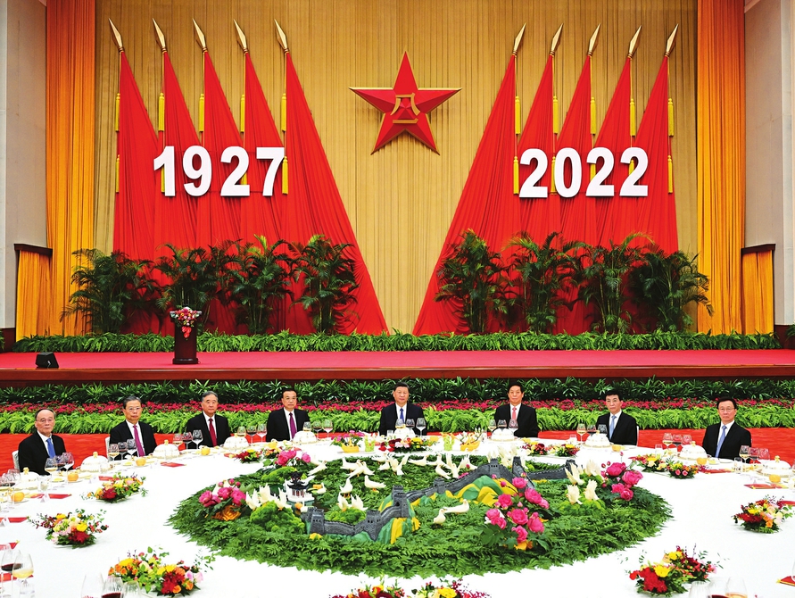 中华人民共和国国防部7月31日在人民大会堂举行盛大招待会,热烈庆祝中国人民解放军建军95周年。中共中央总书记、国家主席、中央军委主席习近平和李克强、栗战书、汪洋、王沪宁、赵乐际、韩正、王岐山等党和国家领导人出席招待会。