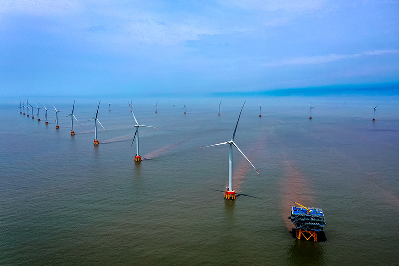 2021年5月16日拍摄的浙江舟山北部海域的中广核岱山4号海上风电场(无人机照片)。新华社发(姚峰 摄)