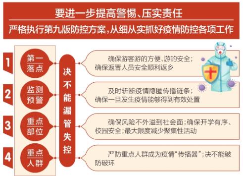 林武指出,近期全国疫情形势严峻,我省外防输入风险加大,常态化防控任务繁重艰巨。要进一步提高警惕、压实责任,严格执行第九版防控方案,从细从实抓好疫情防控各项工作。一是“第一落点”决不能漏管失控。要继续抓好省外风险人员入晋管控,落实好我省关于进一步优化来晋返晋人员落地核酸检测等具体措施,深入做好回溯追踪排查有关工作,从源头上防范疫情输入风险。要研究入晋旅游人员防控服务细化措施,明晰责任链条,确保游客游的方便、游的安全。要全面做好海南返晋航班接机工作,周密部署点对点接返和后续管控服务,确保返晋人员安全顺利返乡。二是监测预警决不能漏管失控。要把提高早发现能力作为重中之重,统筹优化核酸检测工作,落实好风险人员单采单检、优先送检等要求,尽早发现可能的潜在感染者,及时斩断疫情隐匿传播链条。要进一步完善升级多点触发监测预警响应系统,开展人、物、环境等多渠道的监测预警,增强早期监测反应的灵敏性、时效性,确保一旦发生疫情能够得到有效处置。三是重点部位决不能漏管失控。要重点加强暑期交通场站和公共交通工具疫情防控,把好旅客进站、搭乘、出站三道关口,加强远端管控,确保风险不外溢到社会面;重点加强学校开学返校疫情防控,坚持“一地一案”“一校一策”,落实好有关核酸检测、健康监测、静态管理等措施,确保开学有序、校园安全。各地要坚持大型会议活动非必要不举办,持续推动移风易俗,最大限度减少聚集性活动。四是重点人群决不能漏管失控。要紧盯集中隔离场所工作人员、定点医疗机构及发热门诊医务人员、快递从业人员等重点人群,严格落实闭环管理、加密核酸、消毒防护等措施,严防重点人群成为疫情“传播器”。要提高隔离管控工作水平,严格规范管理,细化操作规程,决不能破防破环。